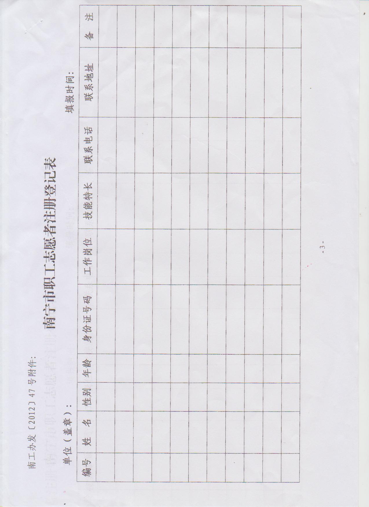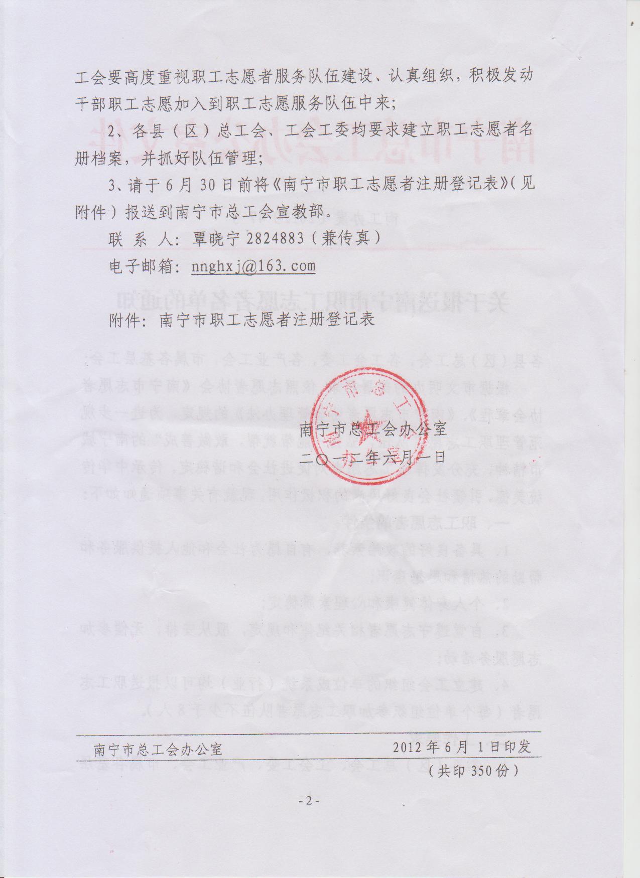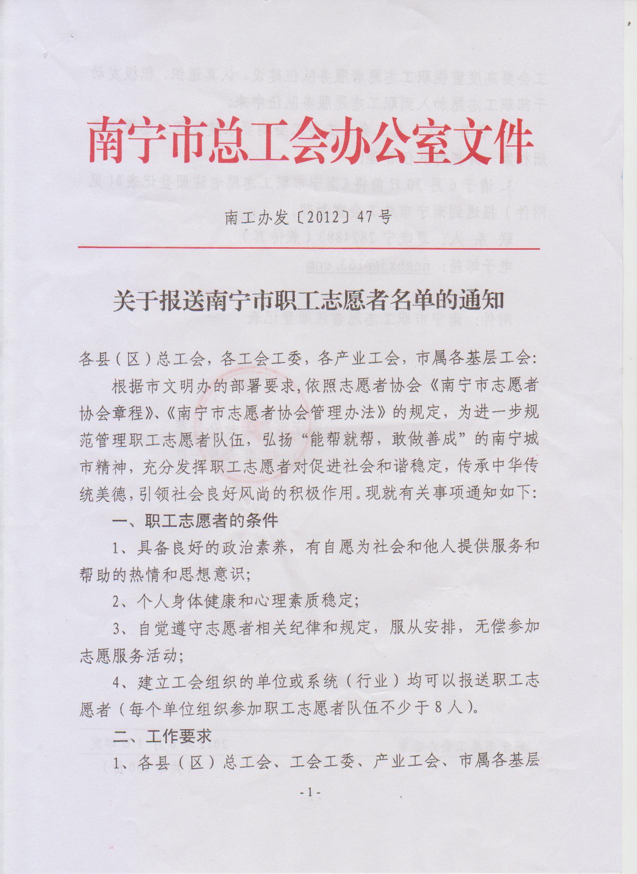 關(guān)于報(bào)送南寧市職工志愿者名單的通知(南工辦發(fā)[2012]47號)