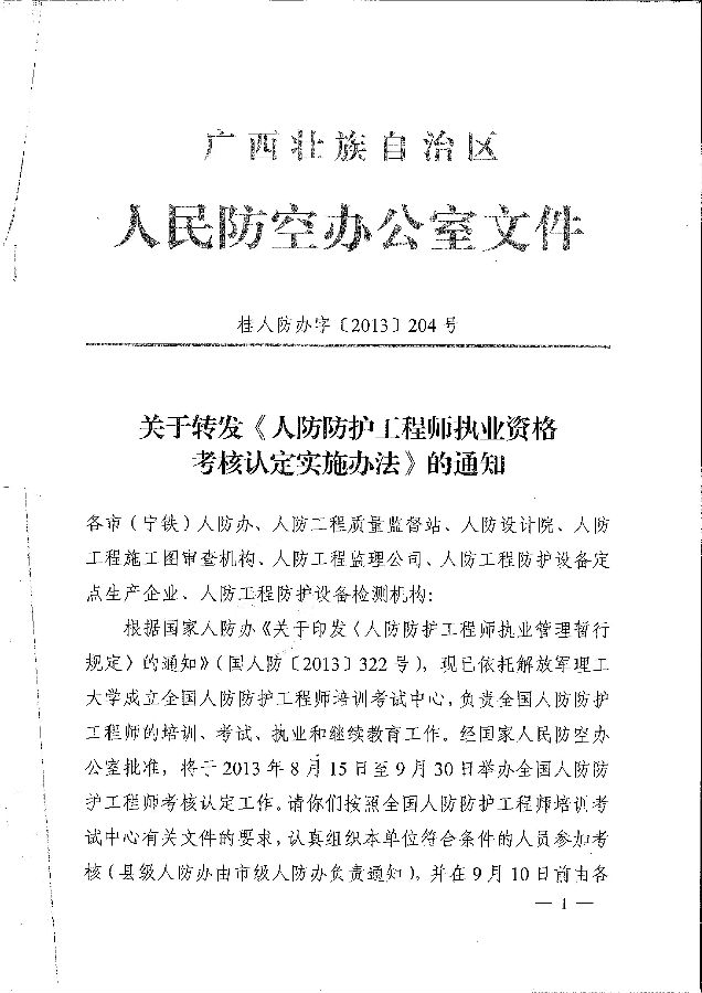 桂人防辦字【2013】204號關于轉(zhuǎn)發(fā)《人防防護工程師執(zhí)業(yè)資格考核認定實施辦法》的通知