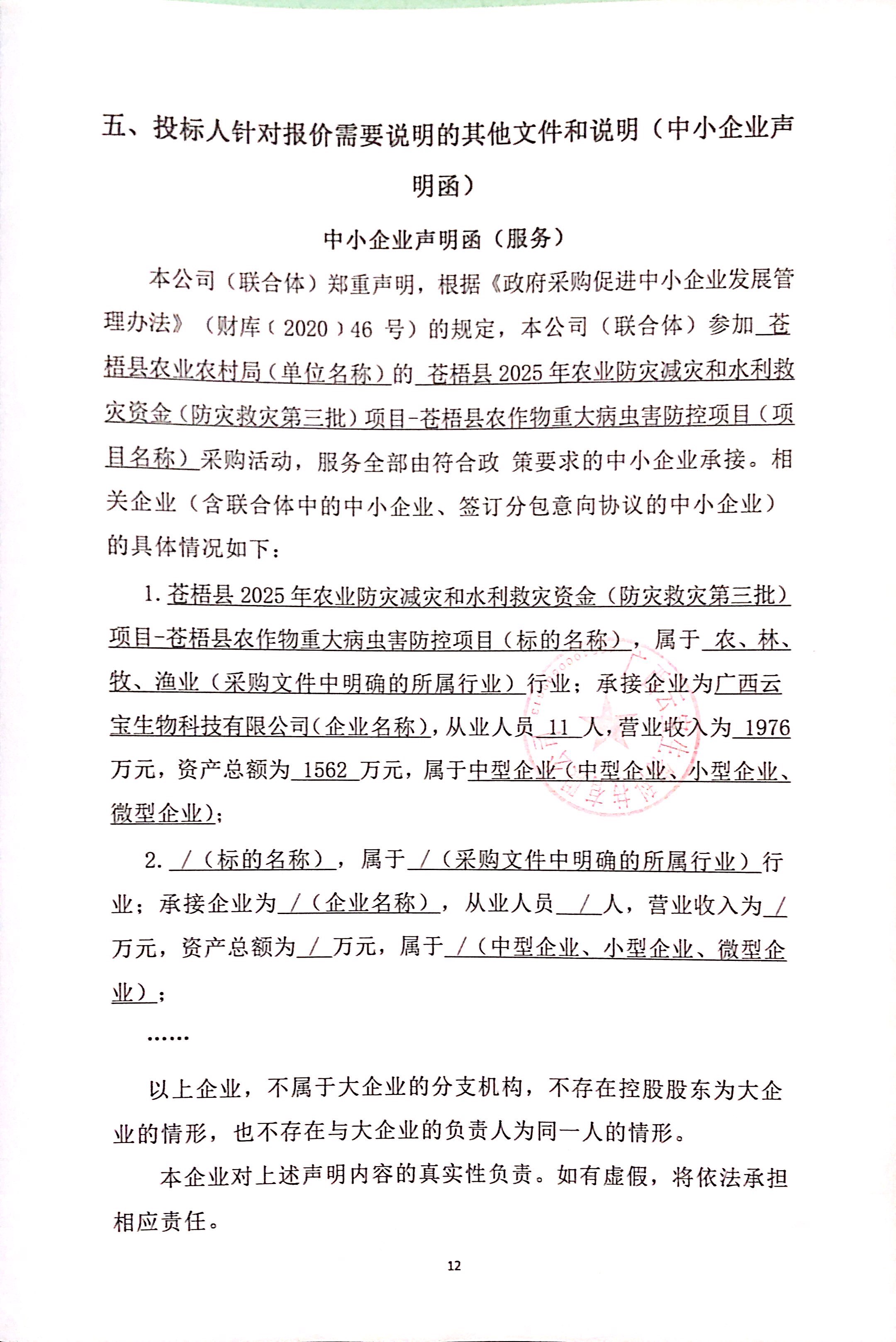 1 | 蒼梧縣2025年農(nóng)業(yè)防災(zāi)減災(zāi)和水利救災(zāi)資金(防災(zāi)救災(zāi)第三批)項(xiàng)目-蒼梧縣農(nóng)作物重大病蟲害防控項(xiàng)目 | 詳見競爭性談判文件和響應(yīng)文件內(nèi)容。 | 合同簽訂后 5 個(gè)工作日內(nèi)供貨,并在 20 個(gè)工作日內(nèi)完成項(xiàng)目內(nèi)容 | 1.國家強(qiáng)制性標(biāo)準(zhǔn)及有關(guān)規(guī)定。 2.競爭性談判采購文件的采購需求及成交供應(yīng)商響應(yīng)文件響應(yīng)的事項(xiàng)。 3.為確保貨物質(zhì)量避免假冒偽劣產(chǎn)品,供應(yīng)商必須在供貨時(shí)提供生產(chǎn)廠家針對此項(xiàng)目的售后服務(wù)保證函原件、供貨證明原件并加蓋生產(chǎn)廠家公章。 4.按以上列明需要提供證書、截圖、文件等資料一并提交我方后才可確認(rèn)驗(yàn)收,不提供或提交不全的不予確認(rèn)。 |