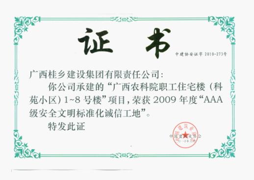 2010年6月,南寧品正負(fù)責(zé)監(jiān)理的半島·旺角1#2#3#5#樓及商業(yè)裙樓及地下室、廣西農(nóng)科院職工住宅樓(科苑小區(qū))工程榮獲中國建筑業(yè)協(xié)會頒發(fā)的 “AAA級安全文明標(biāo)準(zhǔn)化誠信工地”稱號。