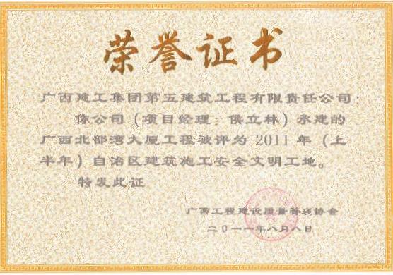 廣西北部灣大廈工程被評為2011年(上半年)自治區(qū)建筑施工安全文明工地榮譽(yù)證書